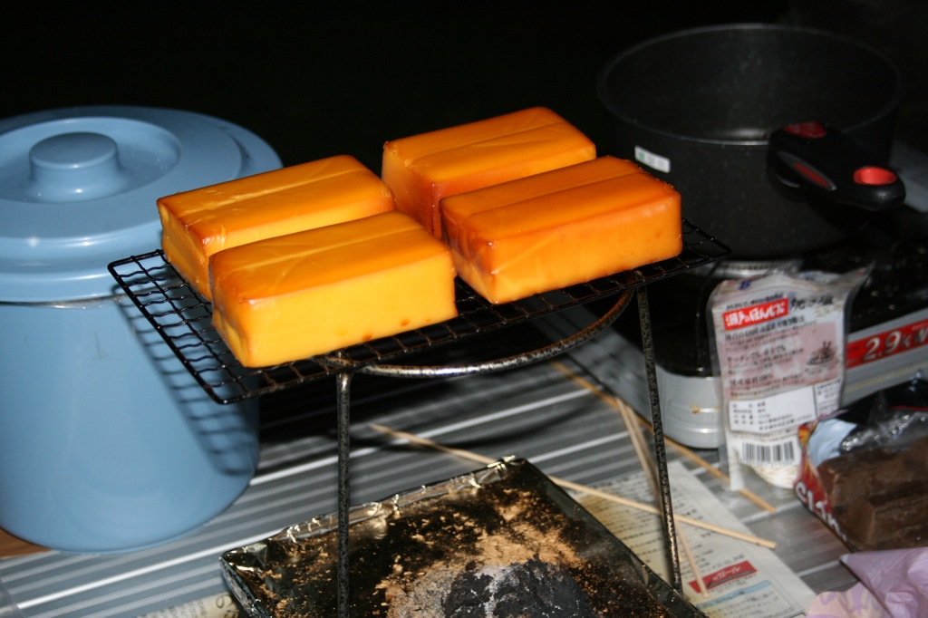 夜ご飯は、肉と米と、奥様渾身のチーズの薫製。あとはソーセージ焼いたり、マシュマロ焼いたり。米は、ここに着いてすぐ呑んだ缶ビールの間で炊きました。もちろん火の当番は、お父さんが全てやりましたよ!!