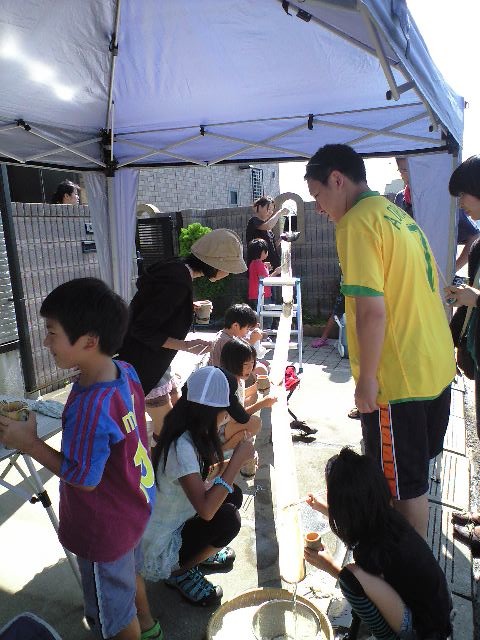 流しそうめんが始めてという子供たちも多く、そうめんを流し始めると